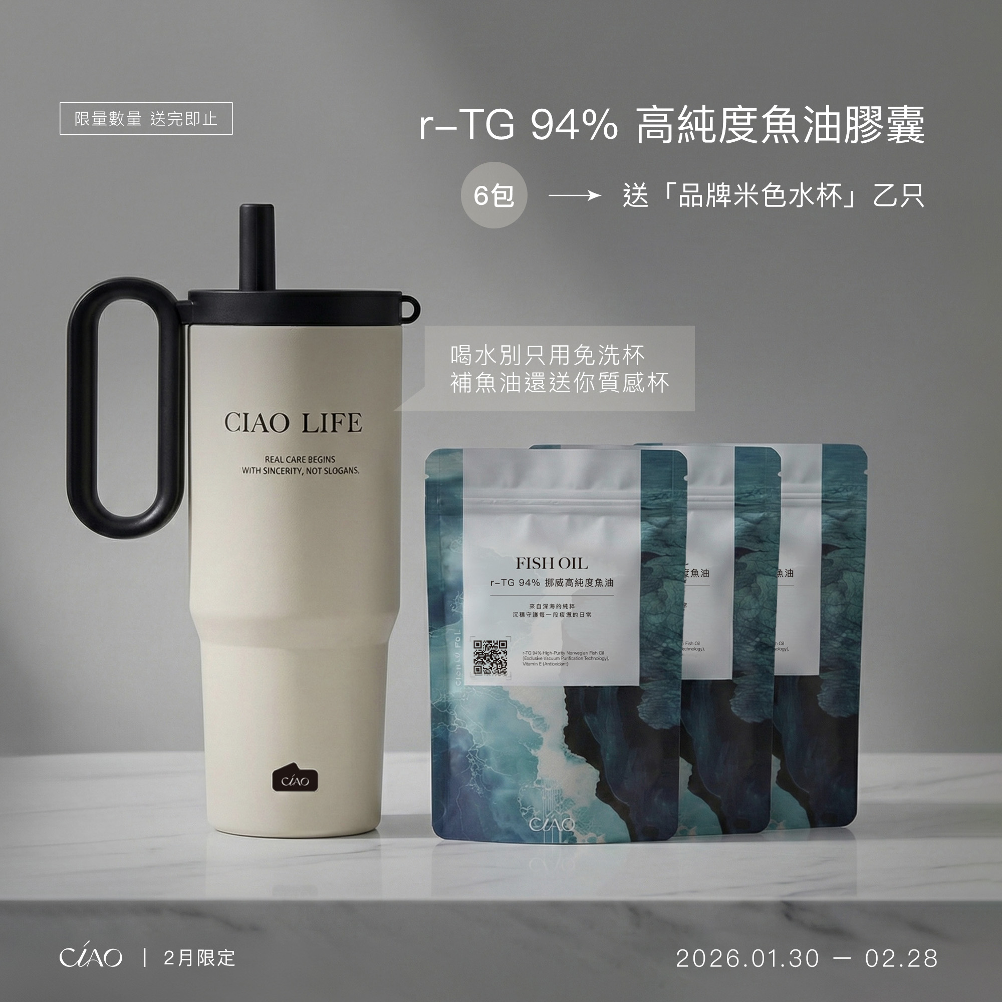 買 r-TG 94% 高純度魚油 6包 送「品牌米色水杯」乙只
